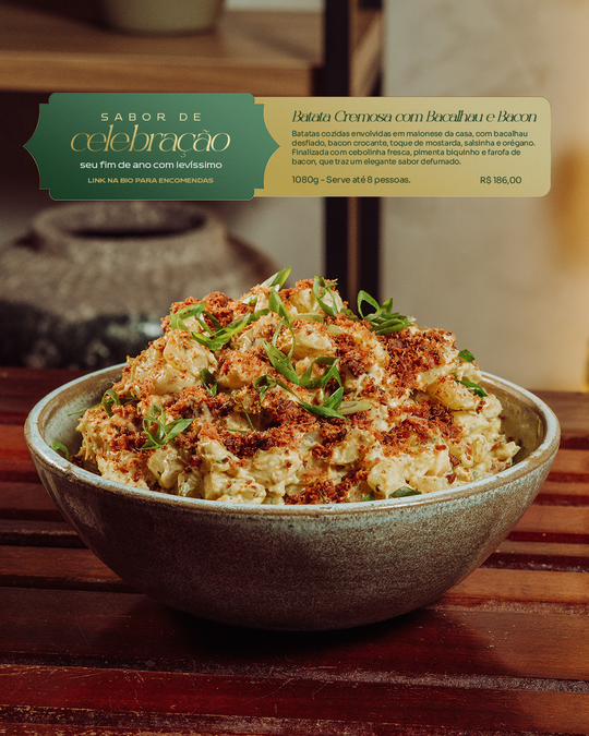 Batatas cozidas envolvidas em maionese da casa, com bacalhau desfiado, bacon crocante, toque de mostarda, salsinha e orégano. Finalizada com cebolinha fresca, pimenta biquinho e farofa de bacon, que traz um elegante sabor defumado.