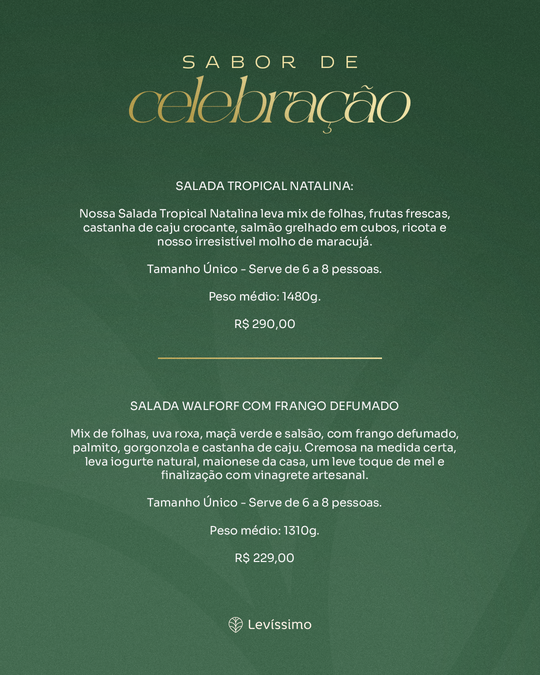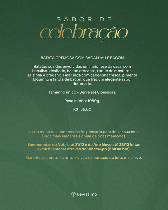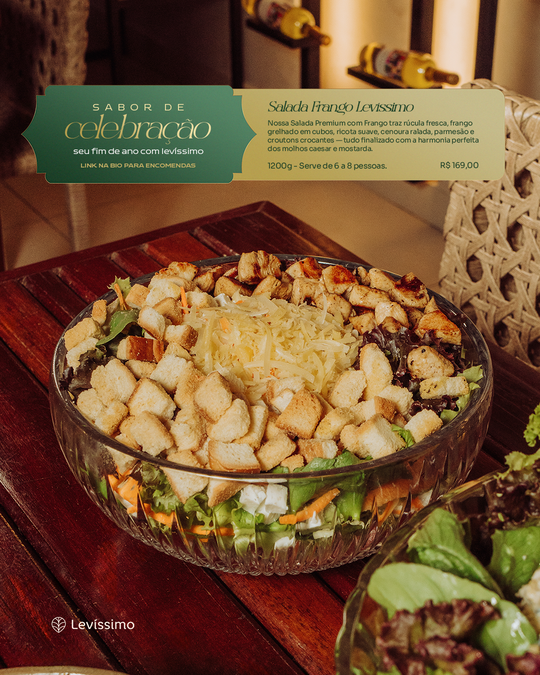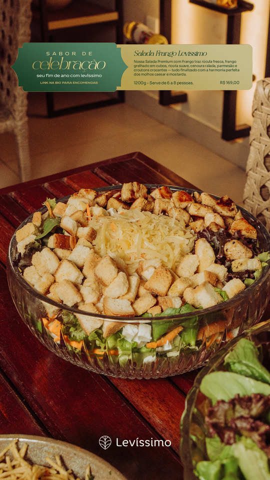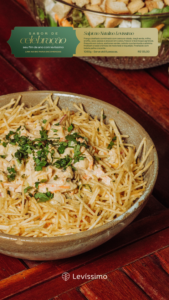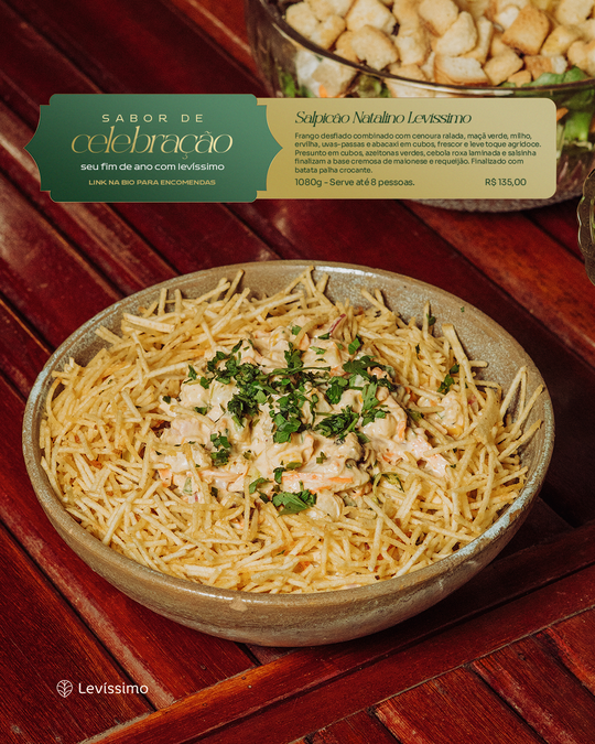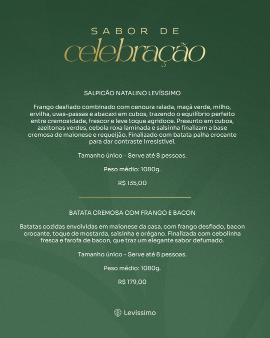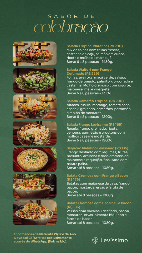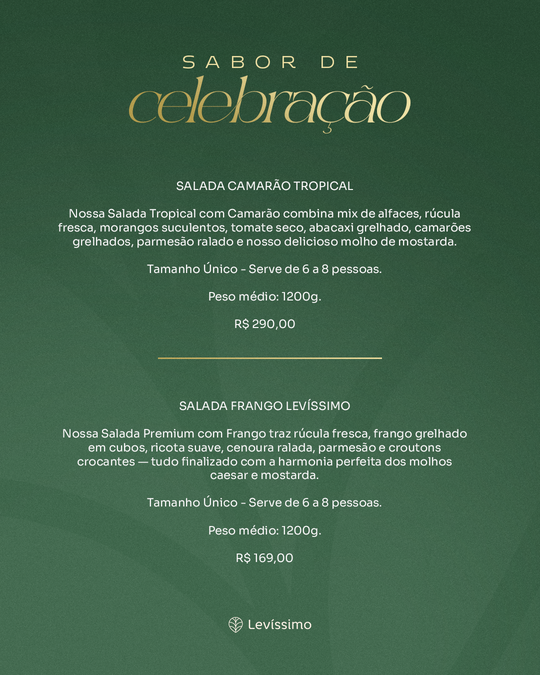 Prepare-se para viver uma experiência deliciosa neste fim de ano com sabores que encantam, acolhem e tornam cada celebração ainda mais especial. Nosso novo cardápio de celebração traz pratos frescos, criativos, cheios de sabor e feitos com ingredientes selecionados — tudo com o toque artesanal que só o Levíssimo tem.