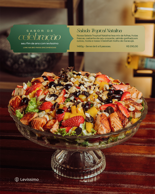 Nossa Salada Tropical Natalina leva mix de folhas, frutas frescas, castanha de caju crocante, salmão grelhado em cubos, ricota e nosso irresistível molho de maracujá.